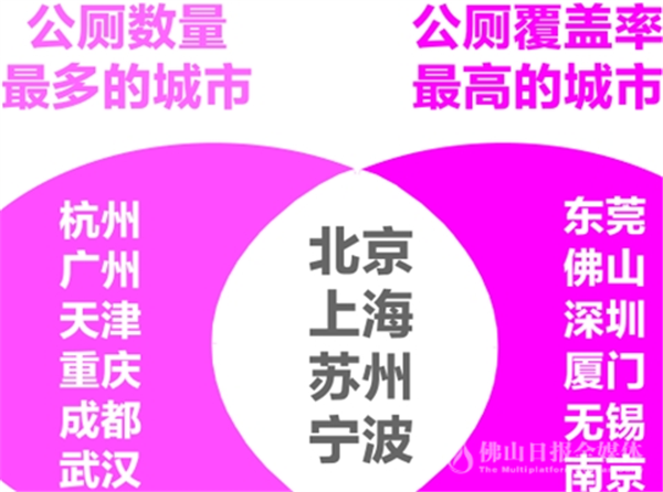 国家文化和旅游部发布的《中国全域旅游厕所导航系统大数据分析报告》,以一个厕所位置点为圆心,以半径500米圆形覆盖面积作为该厕所的覆盖面积,用城市内所有厕所累加的覆盖面积除以城市总面积,得到该城市的厕所覆盖率。在这项城市开放厕所覆盖率排名中,佛山仅次于东莞,排名全国第二,高于第三名深圳。北京、上海、苏州、宁波的公厕数量及覆盖率均居全国前十。
