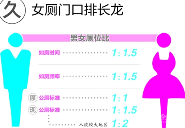 人的膀胱容量为300~500毫升,理论上,女性生理结构比男性更快排尿,但现实生活中女性如厕时间总比男性长。这与女性的如厕方式有关,女性还有生理期,而且女性作为母亲,经常要陪同孩子上厕所,时间就更长了。以前建设公共厕所,男女厕位大多是一刀切1:1。由于男厕小便池不纳入配比,男性实际上拥有更多厕位。住建部2016年发布《城市公共厕所设计标准》,将男女厕位比从1:1提高到1:1.5。