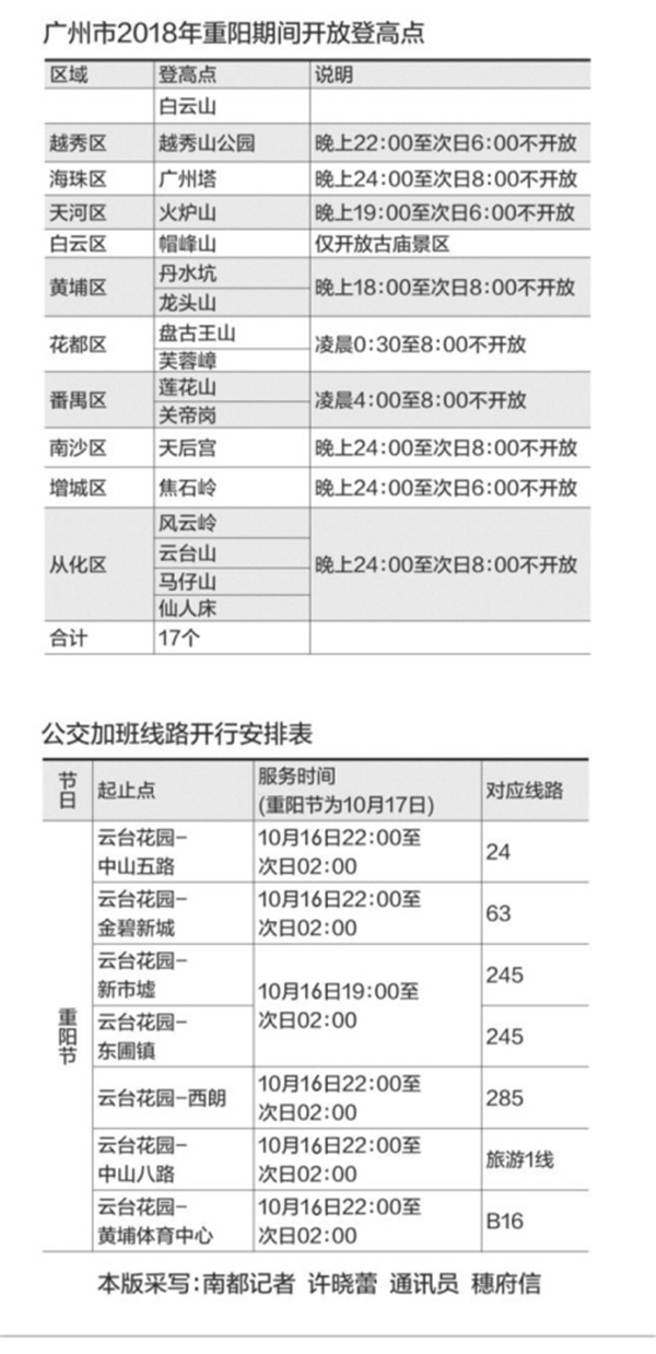 10月16日晚,市交通部门将在人流较密集区域加强运力安排,优化交通组织,保障市民公共交通出行。一是强化云台花园区域公交运营组织。10月16日晚将增开7条重阳夜间加班线路(具体安排附后),优化途经线路发班调度。当日18时起,对进入云台花园总站的线路实施前置下客措施,控制候发区域公交线路停靠车辆,减轻周边路段交通压力。二是做好广州塔、花城广场区域公交保障,实施加密发班、加开短线、空车切入等灵活调度措施,并结合现场客流情况,对开行至客村等区域的如约巴士线路进行疏运。三是加强出租车运输服务,在云台花园、广州塔等区域设置4个临时上落客点,通过出租车调度系统发送终端信息提示,引导出租车司机前往参与运输保障。四是加强现场交通秩序监管,安排运政人员加强出租车服务督察,指挥疏导现场公交、出租车车辆。五是提前在白云山周边区域准备20台公交车应急运力、300辆出租车应急运力,确保现场应急疏运及时、有序。