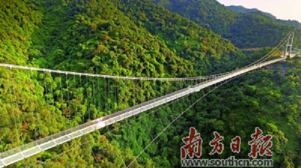南丹山6D玻璃桥正式开放。该玻璃桥长度为379米,桥面距离峡谷的高度为202米,桥面宽度为4米,采用声、光、魔电一体营造出6D效果,可同时容纳700人通过。该玻璃桥以其379米桥面长度为广东省最长的玻璃桥,也是珠三角地区首座高山峡谷玻璃桥。
