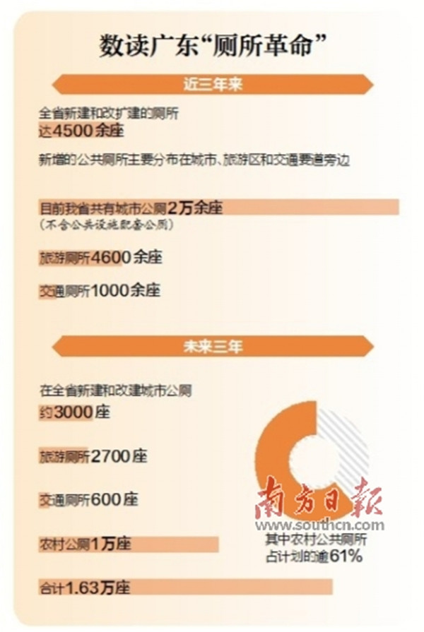 实际上,广东一直大力推动城乡厕所革命。据省住房城乡建设厅透露,近3年来全省新建和改扩建的厕所就达4500余座。不过,这些年新增的公共厕所主要分布在城市、旅游区和交通要道旁边。据初步普查,目前我省共有城市公厕2万余座(不含公共设施配套公厕),旅游厕所4600余座,交通厕所1000余座。