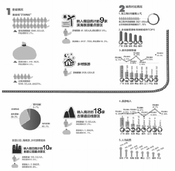 刚刚过去的国庆黄金周,全国各大景点再次出现“只看到人看不到景”的出游盛况。拥有滨海景观、特色民俗、丰富美食、岭南乡村、主题公园等丰富旅游资源的广东,同样迎来了“丁财两旺”的局面:全省接待游客5049 .6万人次,同比增长12 .2%;旅游总收入410 .3亿元,同比增长14 .5%。尤其是以乡村旅游为重点、整合多元旅游资源的全域旅游发展初见成效,全国各地共有3135 .6万游客赴广东各乡村游玩。
