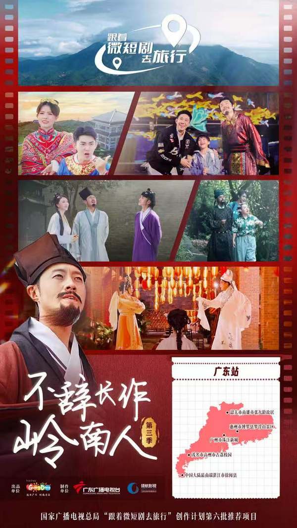 2025年3月27日,在第十二届中国网络视听大会精品微短剧创作论坛上,国家广播电视总局正式发布第六批“跟着微短剧去旅行”创作计划推荐剧目。由广东省文化和旅游厅出品、广东广播电视台制作的系列微短剧《不辞长作岭南人》(第三季)成功入选,该系列微短剧自1月29日(蛇年大年初一)首播以来全网播放量突破1500万并仍在持续增长。
